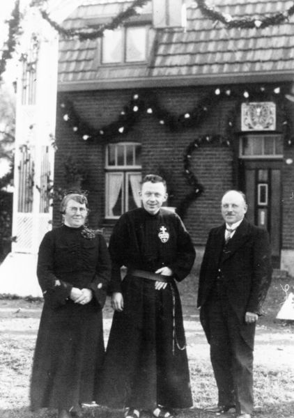 Pater Rafaël (Harrie Kleyne) met zijn ouders. Op 22 augustus 1937 droeg hij zijn eerste heilige mis op. Harry was geboren in Reuver op 5 juli 1911. Op 11 april 1937 werdt hij tot priester gewijd. Op 20 mei 1947 vertrok hij naar de missie. Tijdens zijn dienstreis waarbij hij op de Pasagoewan rivier voer, kwam hij om op 27 februari 1952. |