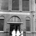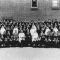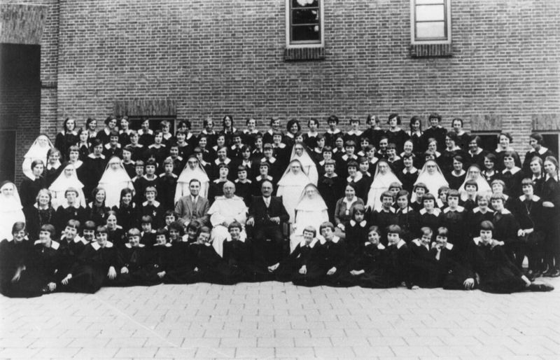 Groepsfoto van alle leerlingen en het onderwijzend personeel van de kweekschool voor onderwijzeressen en ULO in Reuver. Links zit zuster Blanca, lerares Duits. Naast haar de club van vijf. Ze droegen een vierkante stuiver aan een blauwe band. Van l. naar r.: Truus Caris (Reuver), To Goossens (Reuver), Jeanne Vroemen (Reuver), Mia Joosten (Venlo), Lenie Zegers (Panningen). Links boven zr. Philippa, lerares natuurkunde Onder haar Zr. Pacifique, Naast haar zr. Nedarda, lerares Letterkunde Meer ... |