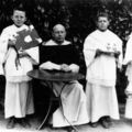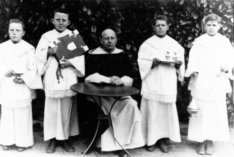 Groepsfoto van de misdienaars en de pater in de tuin van het klooster. van links naar rechts: 1 Pierre Kleyne, 2 Harry Kleyne, 3 prior Elsensohn, 4 Sef Thijssen, 5 Harrie Thijssen. |