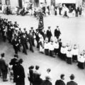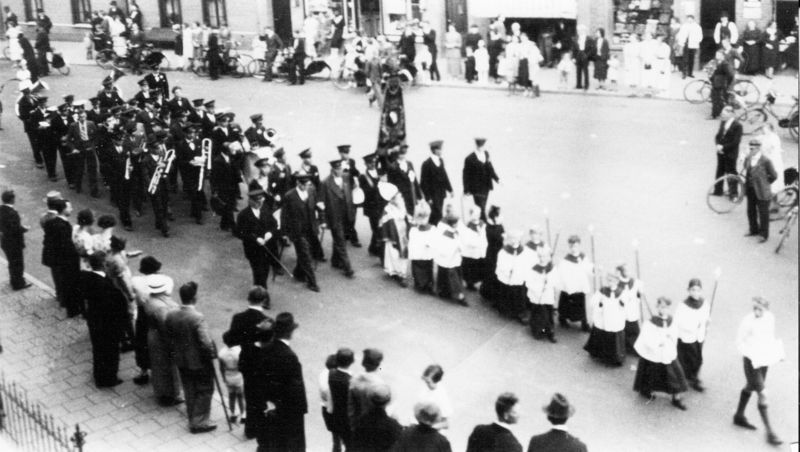 Kerk en religie | De harmonie trekt mee met de Kindsheidsoptocht. Voorop lopen de misdienaars. | Pastoor Vranckenlaan 4 | Reuver | 1935 | ||||