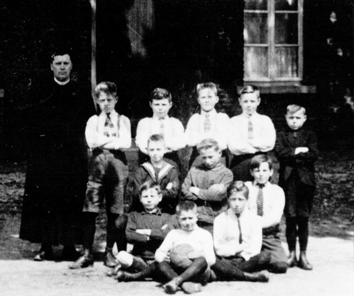 Kapelaan Peeters met een voetbalclubje vóór het patronaat. Op de foto zien we: Kapelaan Peeters, Sjaak Brinkman, Harrie Korsten, Harrie Rijnders, Sef Muller, Willie Muller, Frans Goossens, Bèr Peeters, Herman Bors, Sjeng (Jan) Dohmen, Herman Thijssen. Achterste rij: 1 Kapelaan Peeters , 2 , , 6 Sjeng (Jan) Dohmen middelste rij: voorste rij: |