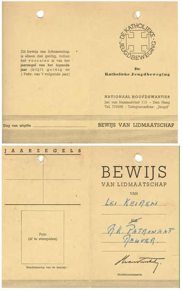 Documenten | Als men vroeger lid was van de Katholieke Jeugdbeweging was kreeg men daar een bewijs van, zoals Lei Keiren. | Keulseweg 22 | Reuver | 1956 | ||||