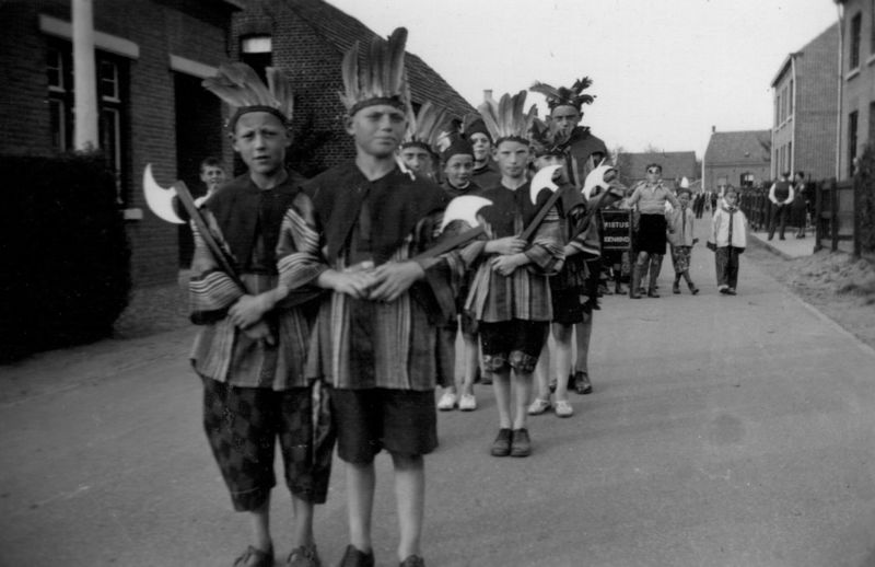 Indianen die bij de Kindsheidoptocht meelopen. Op de foto vooraan links Michel Adams daarnaast Jan Heinen en achter hem loopt Jan Backus. |