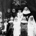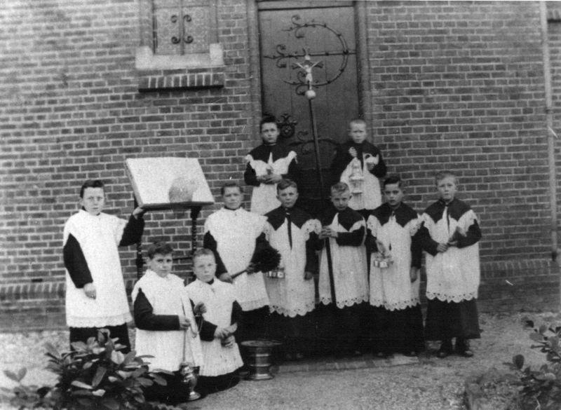 Misdienaars voor de sacristie rond 1920. H. Kleyne W. Thijssen , P. Kleyne , J. Thijssen ?, Rovers Van Diek (van het café bij station), H.Litjens, J. Schoolmeester, H. Pubben, H. Rijnders. namen J. Schoolmeesters. |