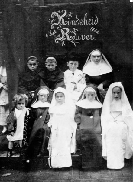In 1919. werd waarschijnlijk de eerste kindsheidsoptocht gehouden en wel op kermismaandag. We zien hier een groepje uit de optocht van 1920. Vanaf het begin van de 20e eeuw, maar vooral vóór de Tweede Wereldoorlog werden er in veel plaatsen (jaarlijkse) optochten georganiseerd, waarin de kinderen verkleed al missionaris, missiezuster, neger, Chinees of indiaan meeliepen. Op de foto zien we Matthieu Muller, Sef Beckers, Harry Kleyne, An Killaars, Laurens Pubben, Jeanne Thijssen en Antje Peeter Meer ... |