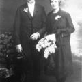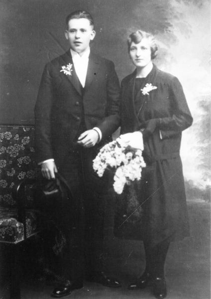 Trouwfoto van Thei Timmermans en MIna Huys (uit Sevenum). Ze zijn gaan wonen in het ouderlijk huis naast het nieuwe huis van hun ouders (Jean Timmermans en ?) . Thei Timmermans staat in de omgeving bekend als Kruutjes Thei. Ze krijgen negen kinderen: Nellie, Jan, Thei, Miep, Jos, Jessie, Jeanne, Gerd en Wim. |