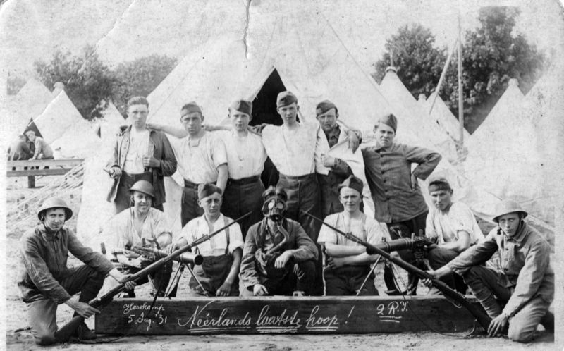 Neerlands Laatste Hoop. Een groep soldaten waaronder enkele Belfeldse militairen gefotografeerd in Harskamp in de generaal Winkel kazerne 1931. Knielend derde van links is Leike Reinders, en knielend tweede van rechts Frans Gitmans. |