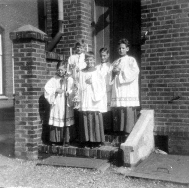 Misdienaars van de Sint Lambertuskerk. Van links naar rechts: Ger Geerlings, Wim Ramaekers, Ton Verlijsdonk, Joop Lighthart en Albert Rutten. |