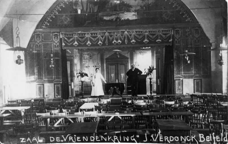 Het interieur van zaal "De vriendenkring" van J. Verdonck tijdens de voorbereiding op een voorstelling. Later werd dit cafè “het Bergske” |