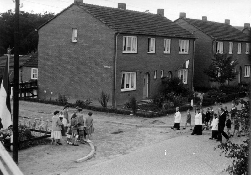 Kerk en religie | De processie trekt door Belfeld. Op de foto zijn ze in de Beatrixlaan | Beatrixlaan | Belfeld | 1952 | ||||