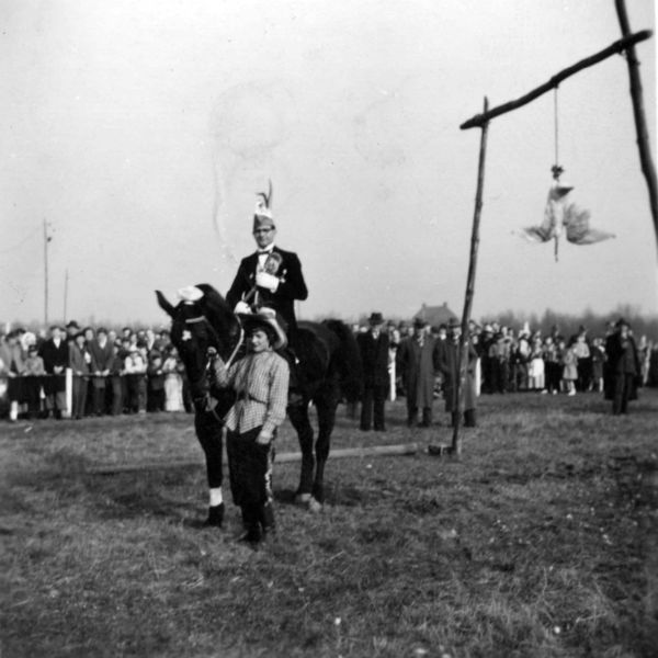 Genkrijden? Ganstrekken. De bedoeling was dat je al rijdend op het paard de gans te pakken moest krijgen waarbij de kop van het lichaam gescheiden werd. Een traditie die gelukkig niet meer bestaat. |