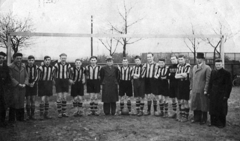 Een elftal van voetbalvereniging Belfeldia met: Cor Boots, Hein Janssen, Jan Timmermans (köster), Theo Boots, Sjeng van Deursen, Theo Hoezen, Frans v.d. Hagen, van Soest (voorzitter), Jan Kustjens, Piet Kurstjens, Piet v.d. Heijden, Gerard Sloesen, Jan Boots, Jan Thijssen, Pau Timmermans en Jan Sloesen. |