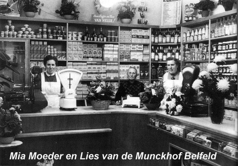 Winkels | De kruidenierswinkel van de familie v.d. Munckhof met achter de toonbank van links naar rechts: Mia v.d Munckhof, Moeder v.d. Munckhof en Lies v.d. Munckhof. | Belfeld | 1955 | |||||