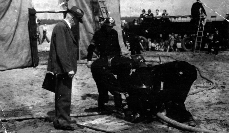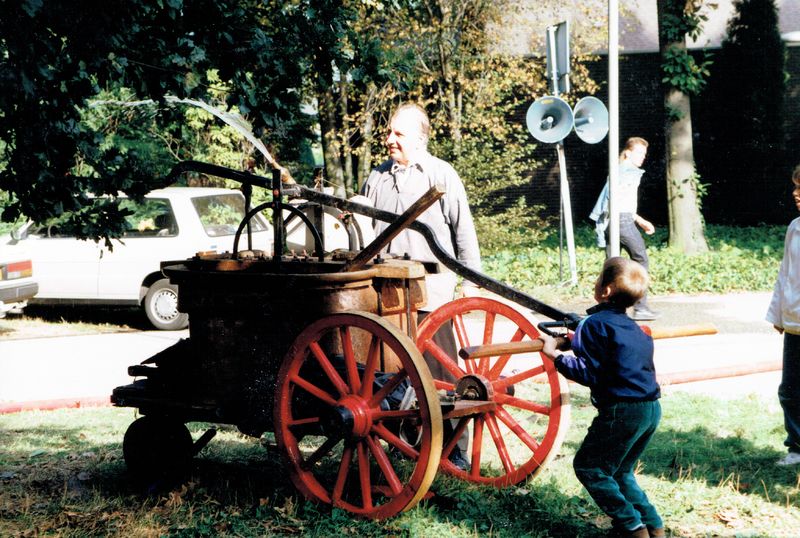 De vrijwillige brandweer van Beesel-Reuver organiseerde een demonstratie met oude brandweer apparatuur. Op de foto zien we een oude handbediende brandspuit. |