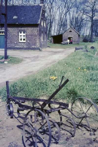 Boerderijen / Agrarische bedrijven | Boerderij van Mobers (De Schei)met een oude cultivator en op de achtergrond het bakhuisje. | Scheiweg 1 | Reuver | 1967 | ||||