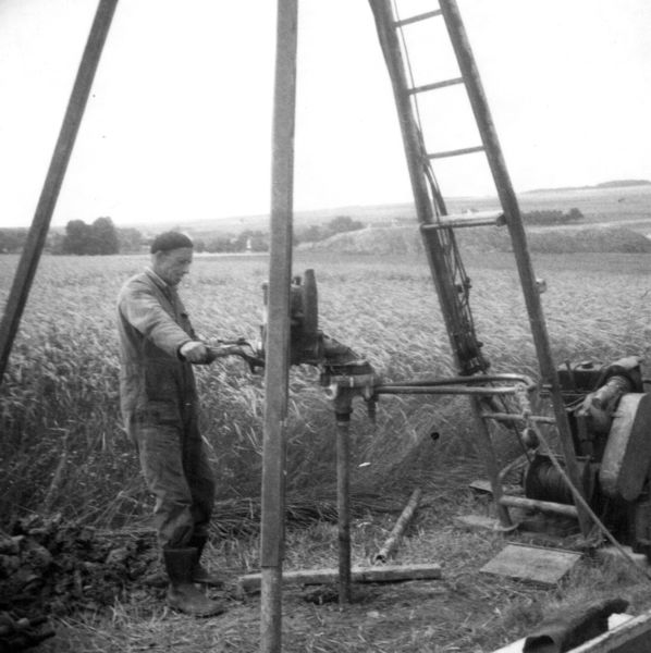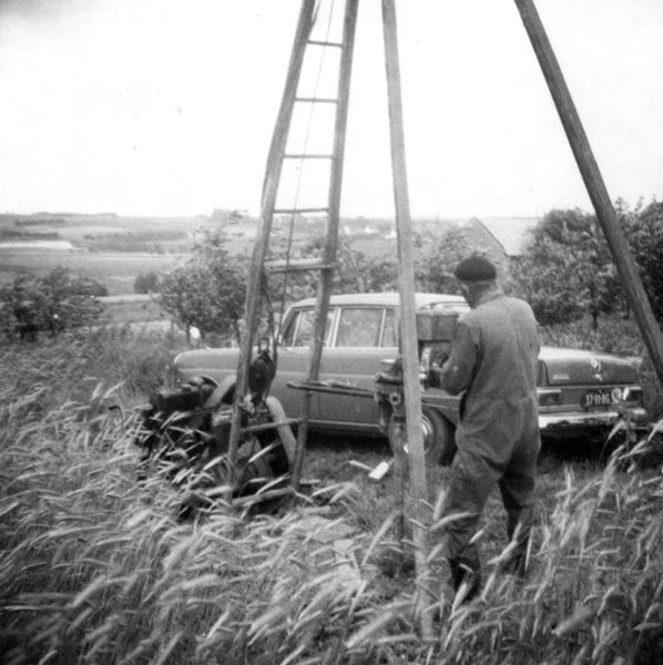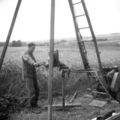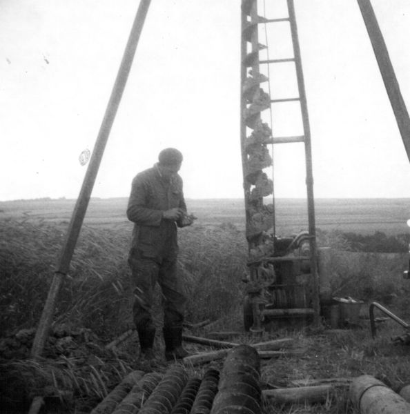 Teunissen grondboringen, zo heette het bedrijf van Cor Teunissen. Cor bezig met de grondboor voor het maken van een nieuwe put. |