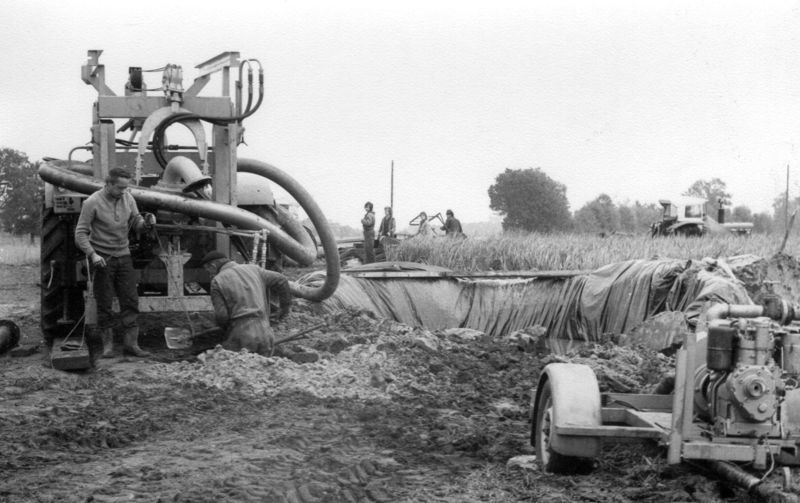 Teunissen grondboringen, zo heette het bedrijf van Cor Teunissen. Het gebruikte water voor het uitspoelen van de boring wordt weer opgevangen in een tijdelijk reservoir. |