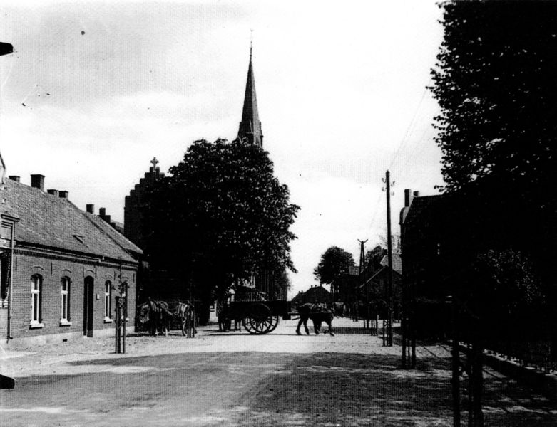 Blik op de Pastoor Vranckenlaan uit 1930. De boeren brengen de eieren met paard en kar naar de eierbond. |
