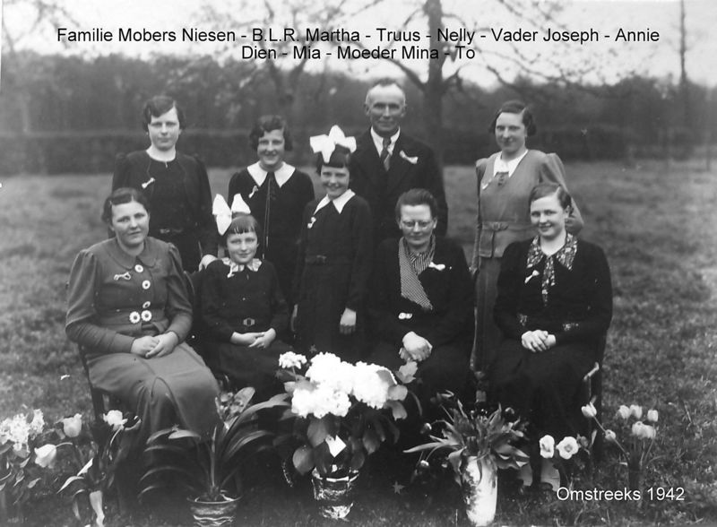 Familie Mobers - Niesen van links naar rechts: Bovenste rij: Martha, Truus - Nelly - vader Joseph - Annie- onderste rij: Dien - Mia - moeder Nina - To |