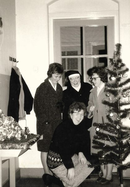 Leerkrachten van de Maria Gorettischool in 1968. van links naar rechts: 1 Bea Dijsens, 2 Zr. Marie Leonie , 3 Lies Roos - Lenaaerts (hurkend), 4 juffrouw Lemmen |