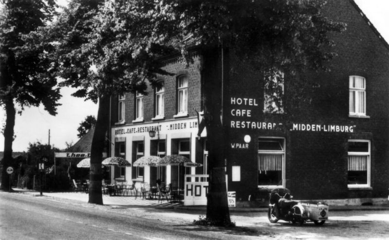 Hotel, Café, Restaurant Midden Limburg. Rechts staat een motor van de ANWB hulpdienst. Als de vlag aan het pand uithangt betekent het dat er hulp gewenst is en dat de hulpdienst onderweg moet. Daar er destijds nog geen mobiele telefonie was, werd het hotel gebeld waar de dichtsbijzijnde hulpdienst een post had. |