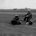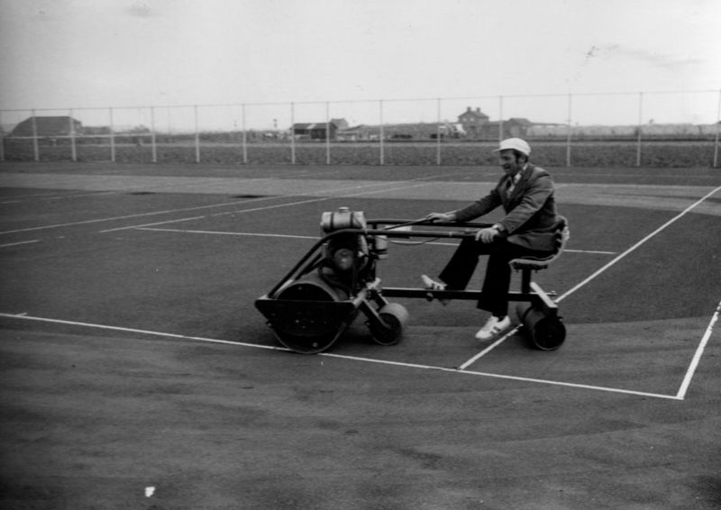Bouw en opening van het sportcentrum " De Poelder". Thei Goossens (onderhoudsman) walst de tennisbanen |