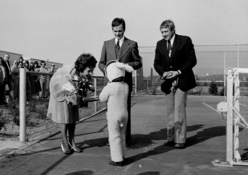 Bouw en opening van het sportcentrum " De Poelder". De tennisbanen worden geopend door Piet Vissers (burgemeester),mevrouw Vissers (links)en Jan Janssen den hollenger eigenaar den Poelder) en Evelien Hendrix (Swalmen) |