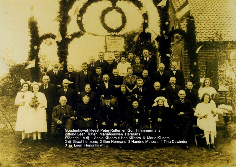 Foto gemaakt ter gelegenheid van het gouden huwelijksfeest van Peter Rutten en Gon Timmermans. zittend: 1 NN, 2 NN 3 Peter Rutten , 4 Gon Timmermans, 5 NN , 6 NN , 7 NN Staande 1ste rij: 1 Annie Killaars, 2 NN, 3 NN , 4 Hen Killaars, 5 NN, 7 Marie Killaars, 8 NN, 9 NN, 10 NN, 11 NN, 12 NN 2de rij: 1 Graat Hermans, 2 Gon Hermans, 3 Handrie Muisers 4 Tina Dewinden, 5 NN, 6 NN , 7 NN, 8 NN 3de rij: 1 NN, 2 NN, 3 NN, 4 NN, 5 Leen Hendriks (in het wit), 6 NN, 7 NN 8 NN |