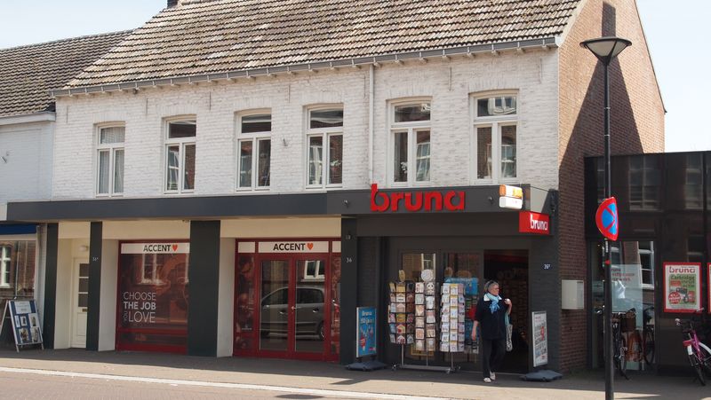 In het pand (Rijksweg 36 en 36a) zijn twee bedrijven gevestigd. Rechts (op 36a) zit de boekhandel Bruna en links zit het uitzendbureau Accent. |