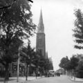 Pastoor Vranckenlaan. Achtergrond Sint Lambertuskerk, links Café Sef Cremers en drogisterij Goossens. Rechts de tuin van brouwerij Van der Velden. |