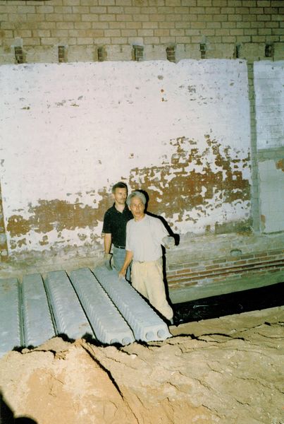 Verenigingen en organisaties | Leo de Jong en Ed Maas bezig met het leggen van de vloer van de kleedkamer in het onderkomen van S.V. Hercules '03 | Henri Hermansstraat 7 | Offenbeek | 1997 | ||||