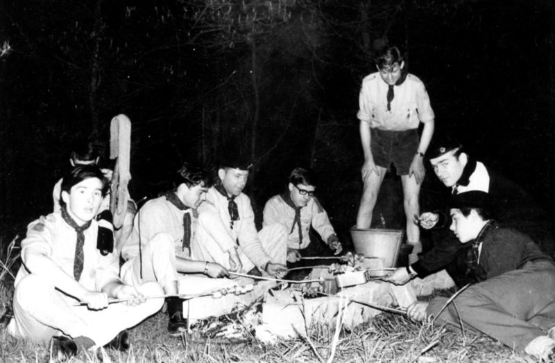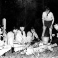 Verkenners Sint Lambertusgroep op weekend in Broekhuizen. Van links naar rechts: Piet Dahmen, Jos Linssen (niet zichtbaar) Paul van der Beelen, Hub van der Linden, Henk Janssen, Ben Hartman, Pierre Teunissen en Koos Teeuwen. |