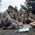 Verkenners van de Sint Lambertusgroep op zomerkamp op de Beegderheide. Van links naar rechts: Frans van Gassel, André van Bavel, Bennie Hartman, John Gubbels en Frits Achten |
