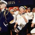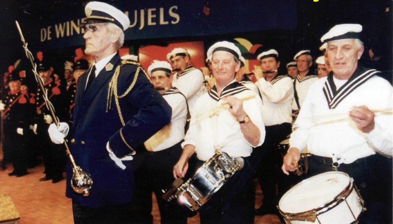 Het trommel- en fluiterkorps St. Barbara viert haar 40 jarig bestaan. Voor die gelegenheid trekken de oud-leden onder leiding van tamboer-maître Baér Dorssers nog eens met elkaar op. Op de foto zien we verder ? |