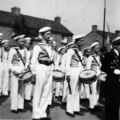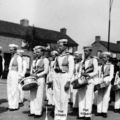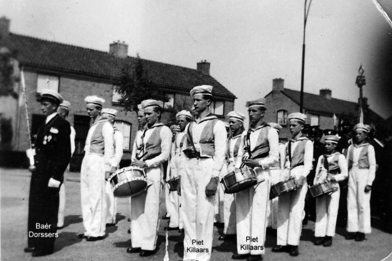 Het trommel- en fluitenkorps St. Barbara tijdens een optreden in Offenbeek met tamboer-maître Baér Dorssers v.l.n.r vooraan Wiel Ottenheim – Joop Gijzen – Piet Franssen – Piet Killaars – Piet Killaars – Coen Ottenheim |