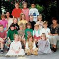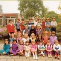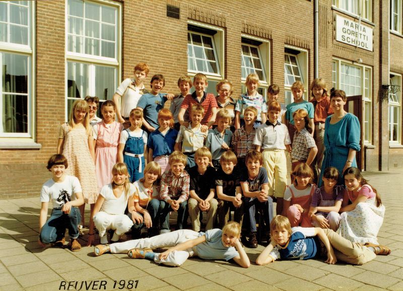Groepsfoto van de Maria Gorettischool uit 1981. In dit jaar nam zr. Lamberto op 10 april afscheid van de school en werd zuster Maria Leonie (midden achterste rij midden) als tijdelijk hoofd en als lerares van de 6de klas aangesteld. Rechts op de foto staat juffrouw Mia Ligthart - Vriessen. Links langs zuster Marie - Leonie is Sjoerd Geerlings. |