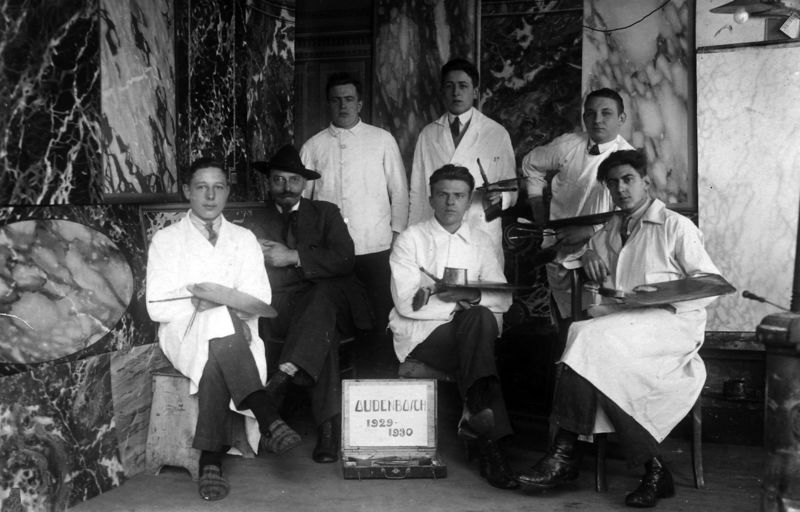 Schildersschool Oudenbosch bij haar jubileum in 1930. Van links naar rechts: zittend: 1 NN, 2 Oudenbosch, 3 Jozef van Gassel, 4 NN Staande 1 NN, 2 NN, 3 NN |