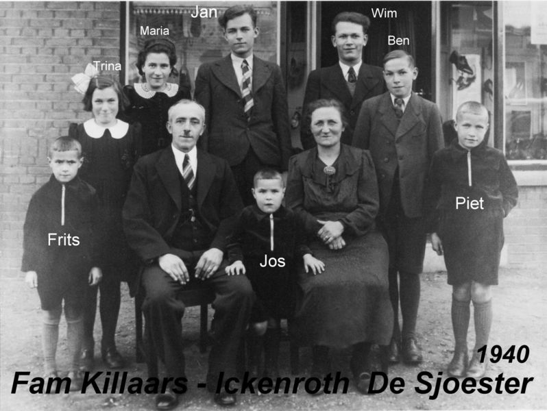 Winkels | Peter en Anna Killaars - Ickenroth met hun kinderen Frits, Trina, Maria, Jan, Jos, Wim, Ben en Piet voor hun schoenwinkel in Offenbeek | Keulseweg 114 | Offenbeek | 1940 | ||||