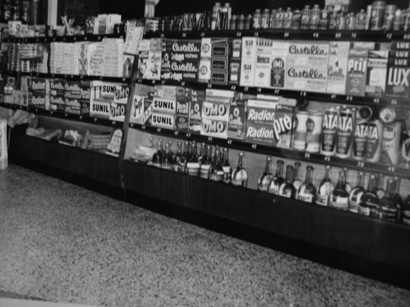 Winkels | Het interieur van de kruidenierswinkel van Lei Denessen. | Parklaan 55 | Reuver | 1957 | ||||