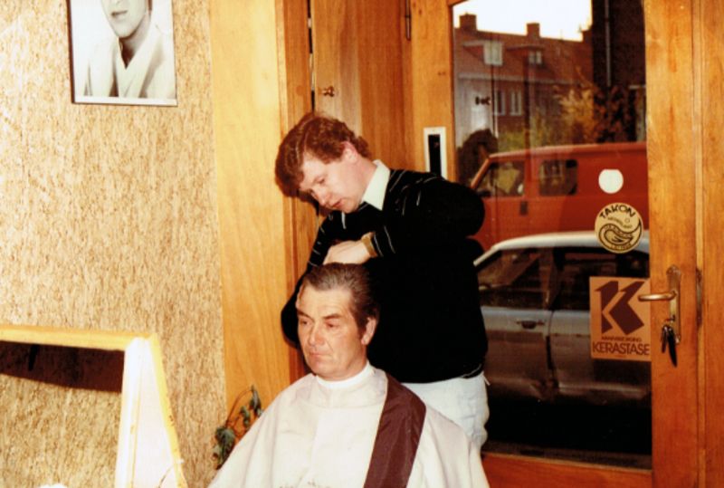 Ton Steeghs bezig met het knippen van de haren van Piet Smets (Naatje). |