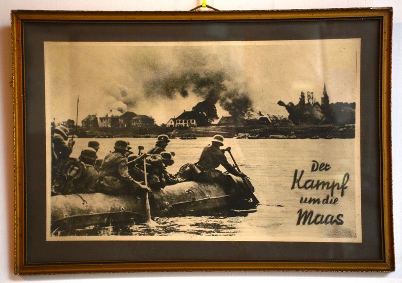 In 2015 organiseerde de heemkundevereniging Maas- en Swalmdal een expositie over de oorlog onder de naam "Oorlogsleid tösse Maas en Pruuse bos". We zien een van de foto's die getoond werden waarbij we het Duitse leger de Maas over zien steken. "Der Kampf um die Maas" staat er als titel op de foto. |