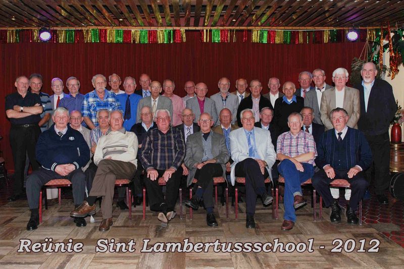 Reünie van de Sint Lambertusschool Reuver 2012 Bovenste rij 1 Frits Hendrix : 2 Piet Spreeuwenberg: 3 Joop Gijzen: 4 Coen Janssen 5 Jan Steeghs : 6 Jan Janssen : 7 Frits Timmermans : 8 Sjra Steeghs 9 Michel Peulen: 10 Koos Augustin : 11 Piet Houwers 12 Jo Beurskens: 13 Wim Veldman : 14 Martien Smeets : 15 Sef Apeldoorn 16 Thei Stinges: 17 Wim Hendrix : 18 Broer Geraeds Meer ... |