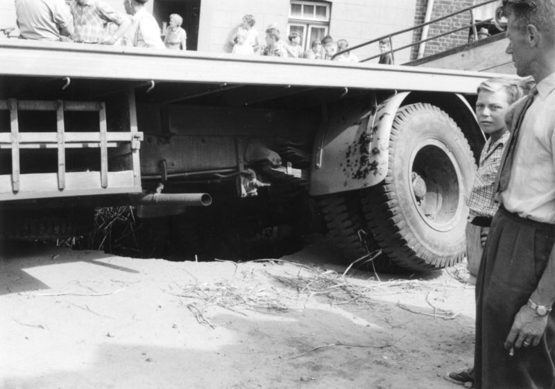 Gebeurtenissen | Verzakking in het wegdek op de hoek van de Mariastraat - Keulseweg in 1962 kort nadat deze weg was verbeterd. | Keulseweg 58 | Reuver | 1962 | ||||