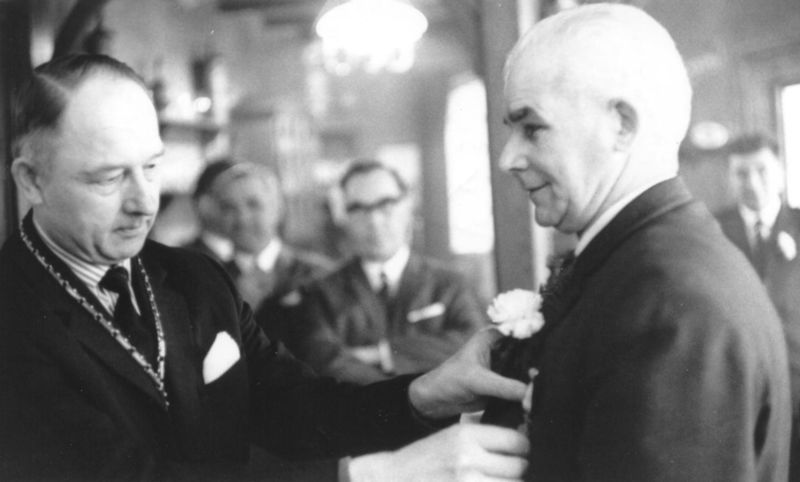 Gebeurtenissen | De heer J. Simons ontvangt van Loco-burgemeester Peters de Eremedaille in Brons. De heer Simons werkte 40 jaar bij St. Joris. | Rijksweg 41 | Reuver | |||||