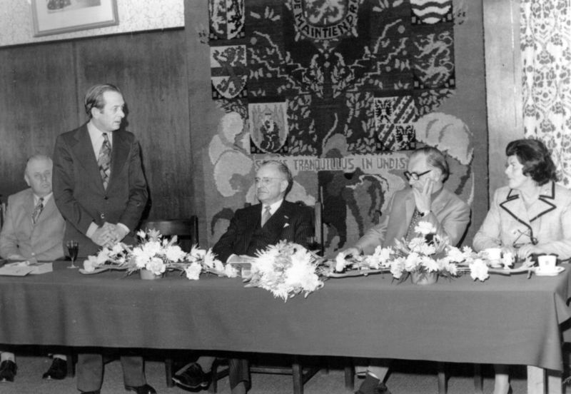 Gemeentehuis / Gemeentebestuur | Uitreiking onderscheiding "Ridder in de orde van Oranje Nassau" door gouverneur Van Rooy op 29 april 1975 i.v.m. het 40-jarig dienstjubileum van burgemeester J.T. Hendrix. | Keulseweg 93 | Reuver | 29-4-1975 | 1975 | |||