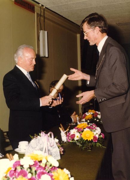 Diversen | 29-4-1987 Uitreiken eremedaille in zilver, verbonden aan de orde van Oranje Nassau, aan J.H.L. Claessen (ABN) door burgemeester Nuytens. | Raadhuisplein 1 | Reuver | 29-4-1987 | 1987 | |||