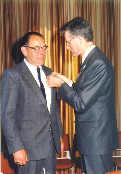 Gebeurtenissen | Koninklijke Onderscheiding. J. de Rijk : Eremedaille zilver voor 40 jaar werk bij de Nijmeegse Zand en Grindmij. | Raadhuisplein 1 | Reuver | 29-4-1988 | 1988 | |||
