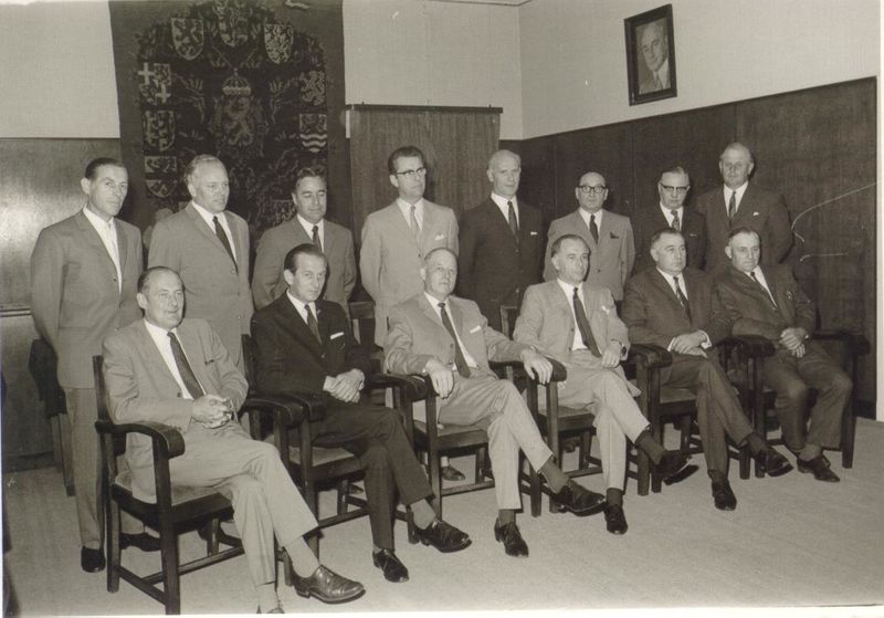 Gemeentehuis / Gemeentebestuur | Gemeenteraad Beesel in 1956. Boven van links naar rechts: Levels, C. Vaassen, Janssen, J. Laumans, Mat Koch, J. Cremers, H. Geraets, F. Heldens. Beneden van links naar rechts: R. Hover, P. Vintcent, J. Peeters, burgemeester Hendrix, W. Thijssen, M. Smeets. | Rijksweg 41 | Reuver | 1956 | ||||
