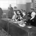 Gemeentehuis / Gemeentebestuur | Afscheid burgemeester Claessen in zaal Janssen te Beesel. De scheidende burgemeester met familie luisteren aandachtig naar de rede van pastoor Gerris. | Rijksweg 41 | Reuver | 1959 | ||||