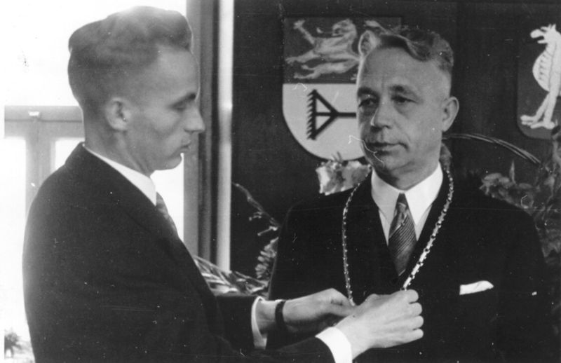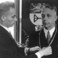 Gemeentehuis / Gemeentebestuur | Installatie van burgemeester J.L.H. Claessen. De heer P. Bongaerts, thans burgemeester van de gemeente Heel en Panheel, hangt de burgemeester de ambtsketen om. | Rijksweg 41 | Reuver | 11-8-1946 | 1946 | |||